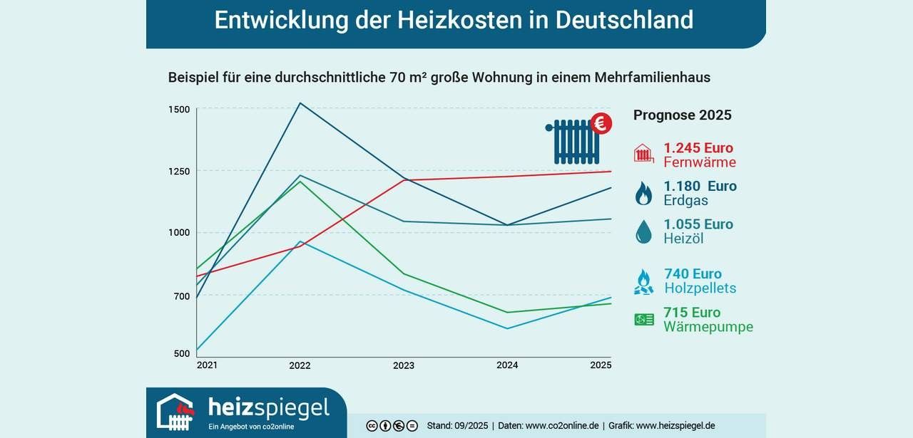 Nach den Daten des Heizspiegels 2025 ist ein klarer Anstieg bei klassischen Heiztechnologien zu verzeichnen: Erdgaspreise werden um 15 Prozent zunehmen, Holzpellets um 20 Prozent. Heizöl verteuert sich um 3 Prozent und Fernwärme um 2 Prozent. Wärmepumpen sind mit einer prognostizierten Steigerung um nur 5 Prozent deutlich günstiger. Schuld daran sind höhere Energiepreise infolge internationaler Marktverwerfungen sowie ein zu Jahresbeginn sehr kalter Winter und löst spürbare Belastungen in Haushaltsetats aus.